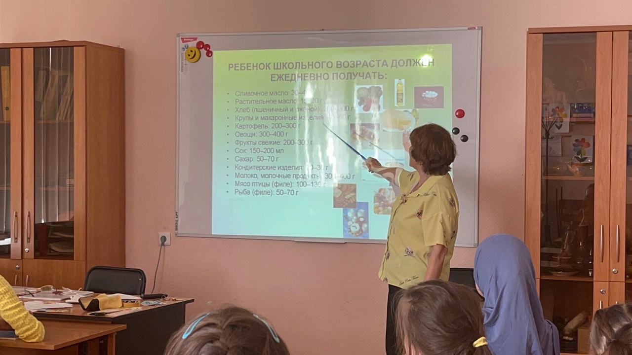 Ребята посмотрели презентацию "Правильное питание - основа здоровья человека", познакомились с основами правильного питания, с её рационом, калорийностью, о пользе горячего питания.